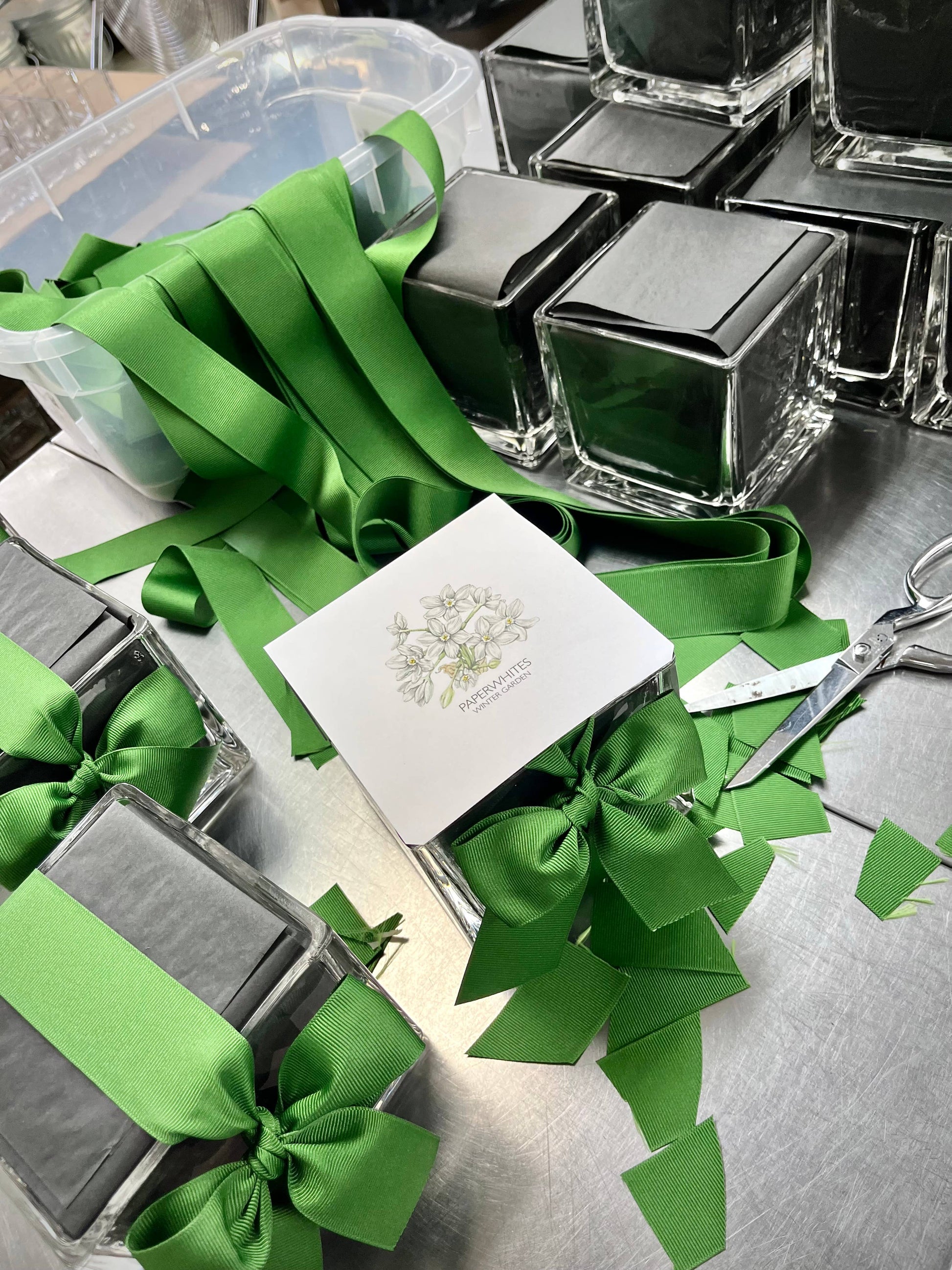 includes: cast glass planter with hand-tied grosgrain ribbon, paperwhite bulbs (Narcissus ziva), soil-less growing medium and directions . handmade in Idaho. Plant by 01/31/2026