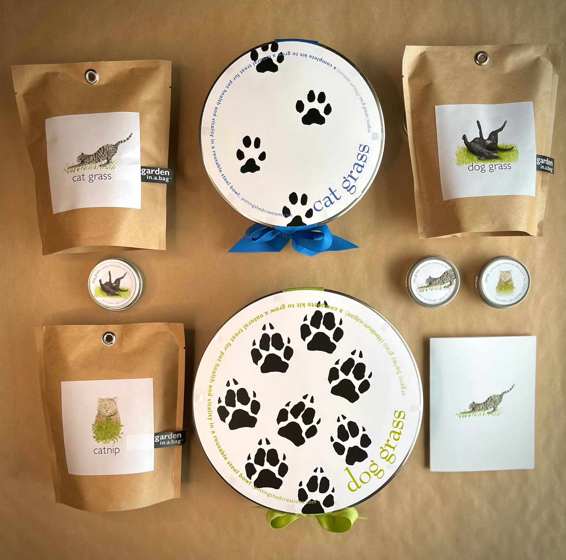 Includes: reusable steel pet bowl, organic seed, OMRI listed soil, hand-tied ribbon and directions. Handmade in Idaho.