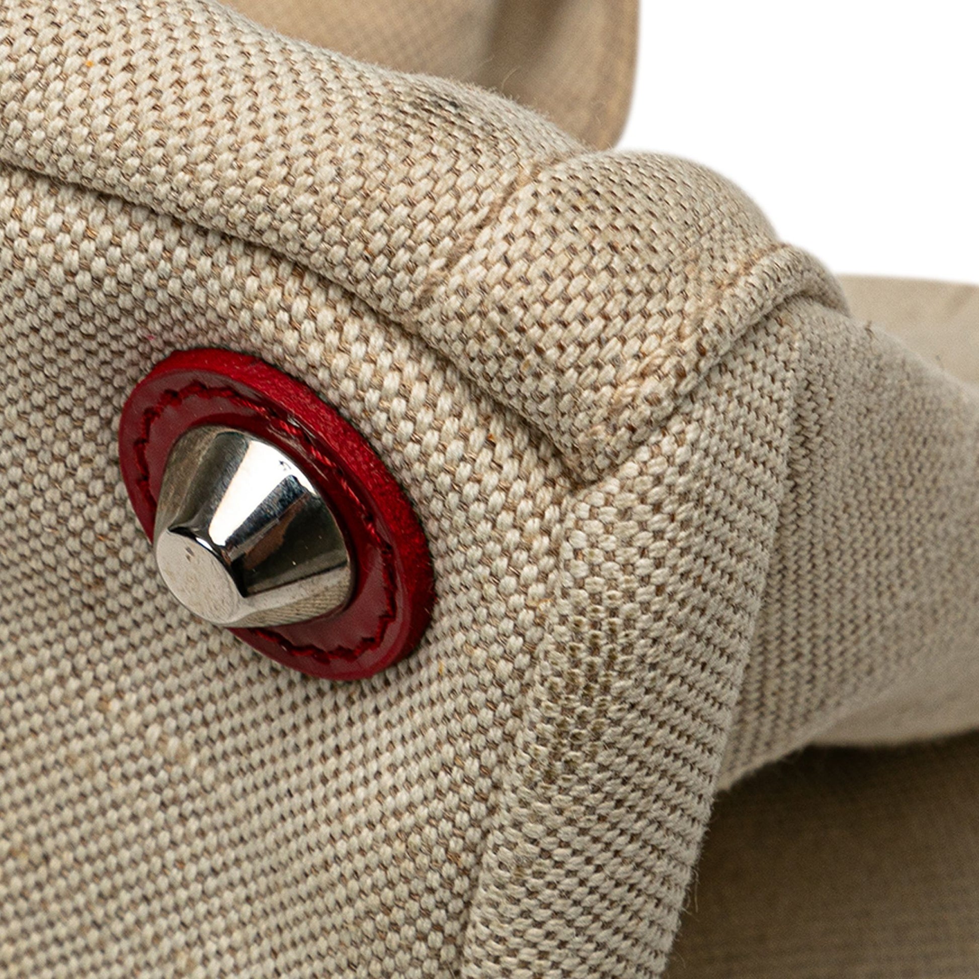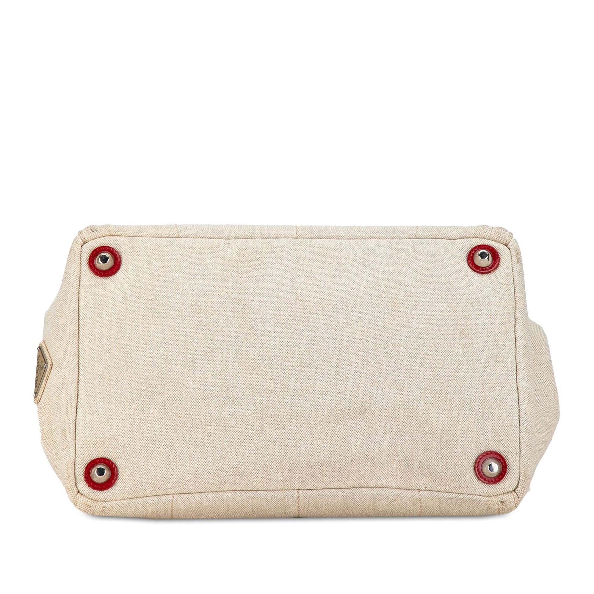 This tote features a canvas body with floral details, rolled handles, an open top, and interior zip and slip pockets.