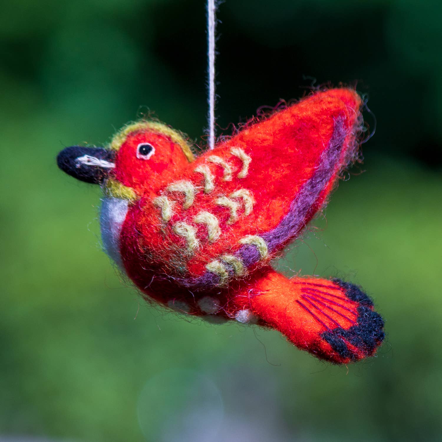 A top seller, year-round! This highly representational bird ornament is educational, decorative and entertaining for birding enthusiasts of all ages. Includes a 3"l string loop and hangtag with a unique UPC label with the specific bird name. Handmade in Nepal. Displays well on our eco-spinner. Wild Woolies are designed and made exclusively for dZi Handmade, member Fair Trade Federation. 5"l